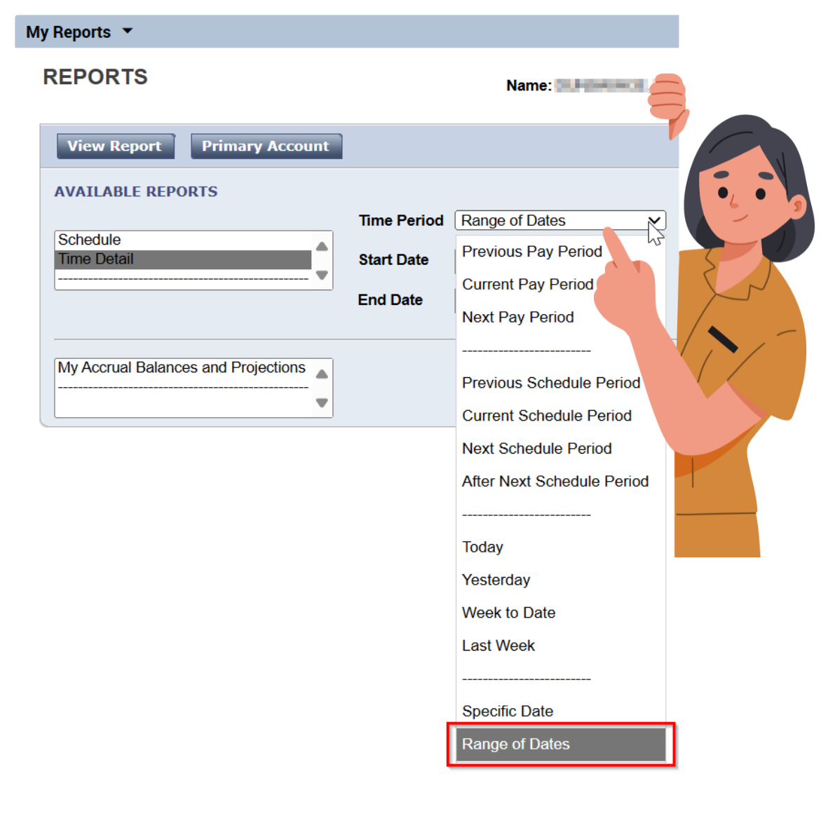2. Select the Time Detail report. Then, you can select the drop down under Time Period and select a specific range of dates. We recommend at least the past thirty days.
