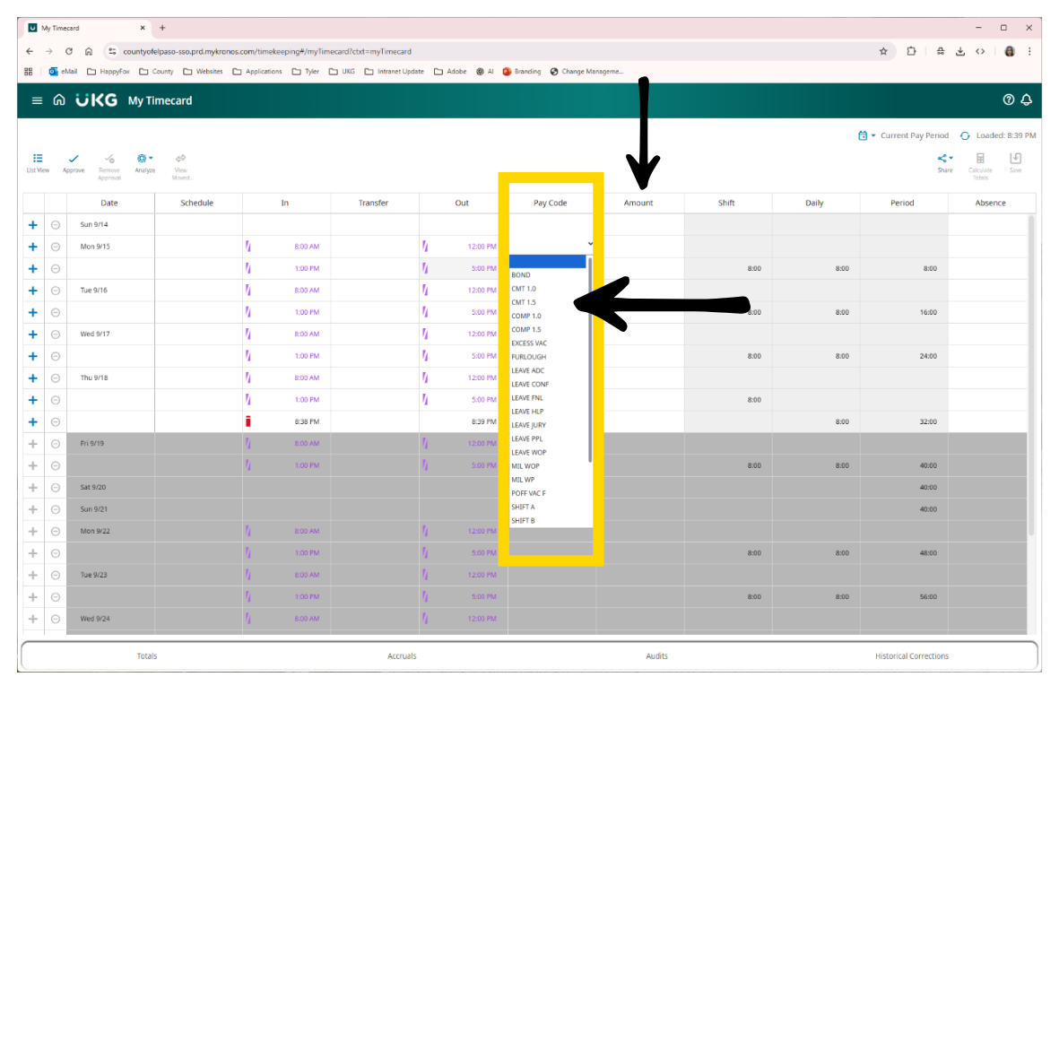If you need to add a paycode to your punch, you will click on the row you need to add your paycode and select the one you need from the dropdown. You will need to enter an ‘Amount’ after you select a paycode.