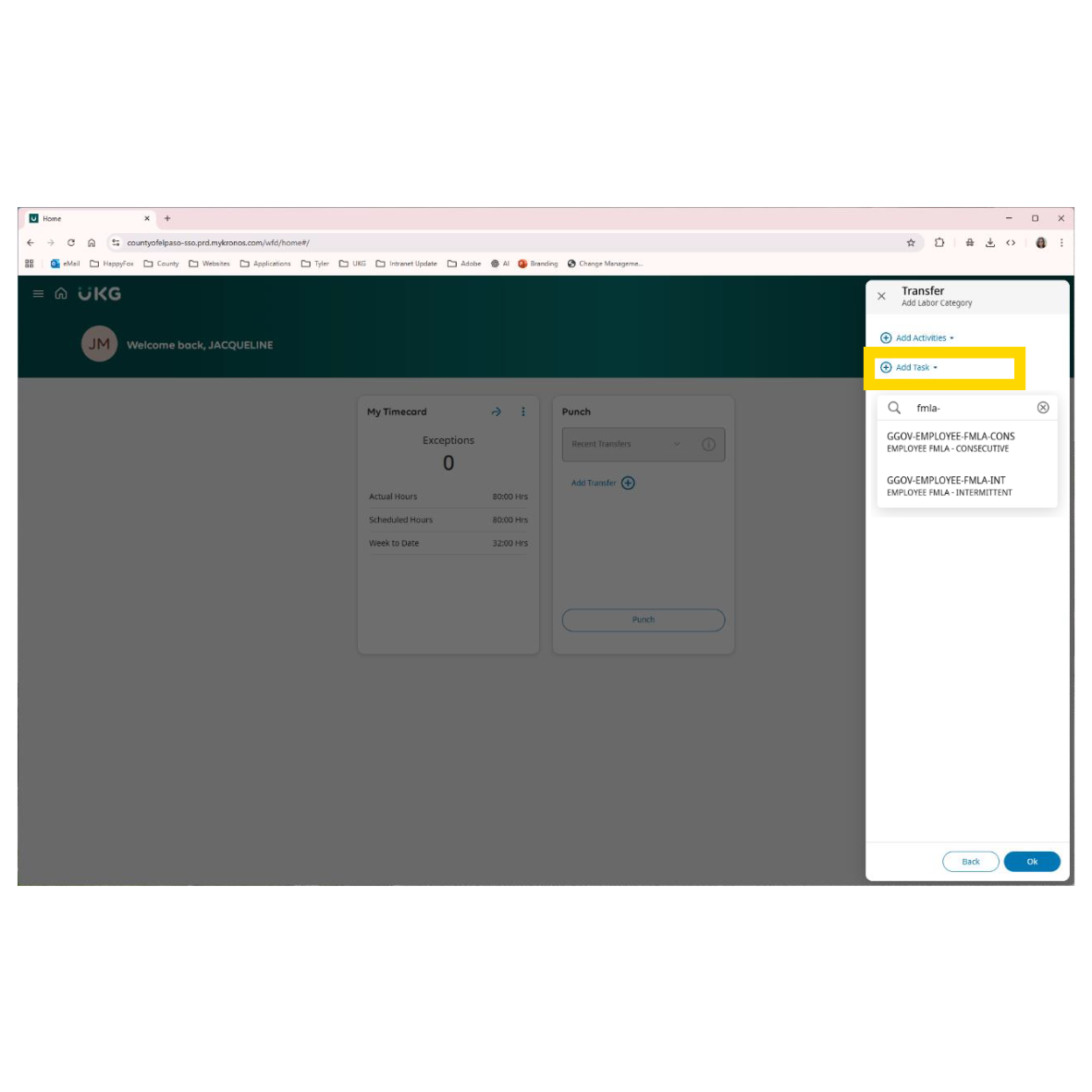 Here you can add either an ‘Activity’ or ‘Task’. Under ‘Task’ type ‘fmla’ and available options will populate. Make your selection and select ‘OK’ on the bottom right.